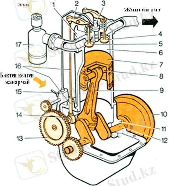 Сурет 1. 8 - Бір цилиндрлі қозғалтқыштың сұлбасы 1 - цилиндр басы; 2 - күйенте; 3 - саптама; 4 жəне 5 - шығару жəне кіргізу клапандары; 6 - цилиндр; 7 - поршень; 8 - поршень саусағы; 9 - шатун; 10 - маховик; 11 - білік төсеніші; 12 - жұдырықшалы білік, 14 - иіндібілік; 13 - біліктер жетегі; 15 - жанармай сорғысы; 16 - беріліс бөлшектері; 17 - ауа тазартқыш