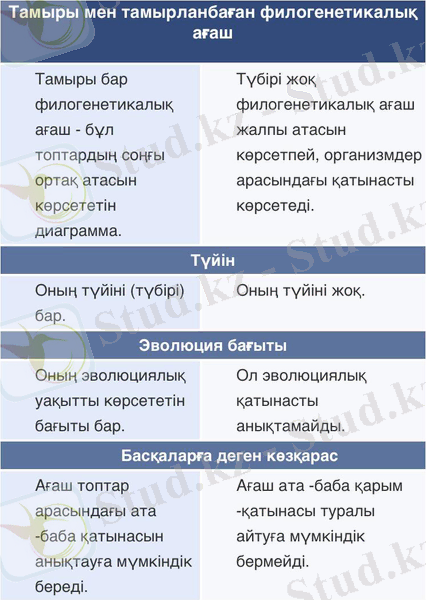- Түбір барлық қарастырылатын объектілердің ортақ атасын білдіреді. Филогенетикалық ағаштың жиектері әдетте «бұтақтар» деп аталады.