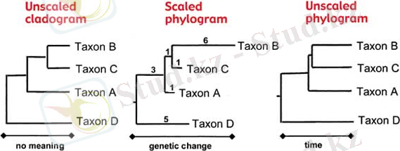 - Кладограмма - бұтақтардың ұзындығы туралы ақпаратты қамтымайтын филогенетикалық ағаш.