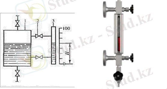Визуалды деңгей өлшеуіштер- сұйықтық деңгейін қарапайым өлшеуіштер. Технологиялық аппаратқа 1 тиекті шұралар арқылы 2 көрсеткіш шынысы (түтік 3) қосылған. Аппарат пен түтікше байланысқан ыдыстар болып табылады, сондықтан түтікшедегі сұйықтықтың H деңгейі аппараттағы оның деңгейіне тең жəне шкала бойынша есептеледі.