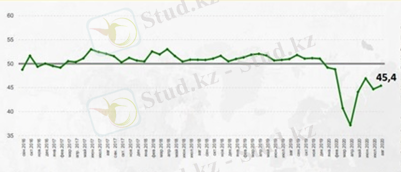 Наурыз және сәуір айларында төмендегеннен кейін индекс құлыптау біраз уақытқа жеңілдетілген мамыр мен маусымда көтеріле бастады. Жаздың бірінші айында ол 46, 8 баллға жетсе, кейін шілдеде ол қайтадан 44, 7 баллға дейін төмендеді. Индексті құрайтын Ұлттық банктің мәліметінше, «карантиндік шаралардың күшеюі қызмет көрсету саласы мен өнеркәсіпке ең үлкен кері әсер етті».