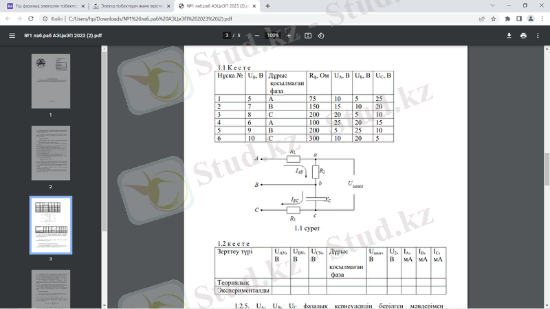 1. 2. 1 Uф фазалық кернеуі берілген үшфазалы тізбек көзіне "жұлдызша" байланысы бойынша жинап, көздің бір фазасы дұрыс қосылмаған жағдайда (1. 1 кесте нұсқасына сәйкес) . UАN, UBN, UCN өлшеу.