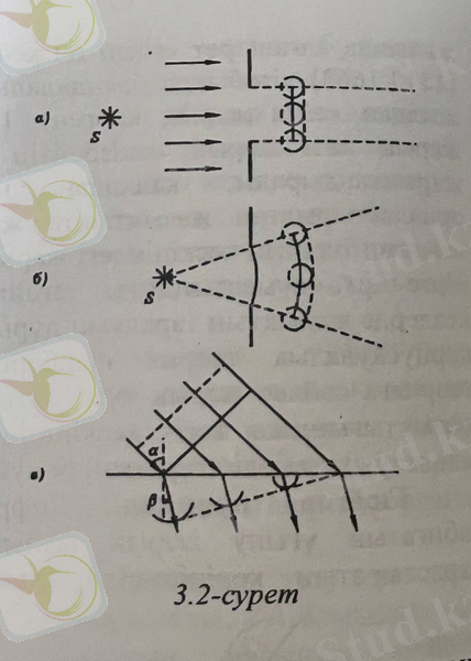 Гюйгенс Френель принципіне сәйкес ∑ толқындық беттің әрбір dꝹ элементі екінші реттік сфералық толқын көзі қызметін атқарады. 3. 4 суретте а оның амплитудасы dꝹ элементінің шамасына пропоционал болады. Сфералық толқын амплитудасы көзден r қащықтықта байланысты 1/r заңы бойынша кемиді. Демек толқындық беттің әрбір dꝹ бөлігінен осы беттің алдында орналасқан нүктеде мынадай тербеліс келеді;