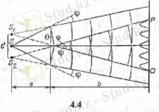 Мұндағы n призманың сыну көрсеткіші. Бипризмаға түсіп тұрған сәуленің түсу бұрышы үлкен емес. Сондықтан барлық сәулелер бипризманың әрбір екінші жартысынан бірде φ бұрышқа ббұрылады. Соның нәтижесінде S пен бір жазықтықта жататын екі S және S жорамал когеренттік жарық көздері пайда болады, ол жорамал жарық көздерінің ара қащықтығы d мынаған тең