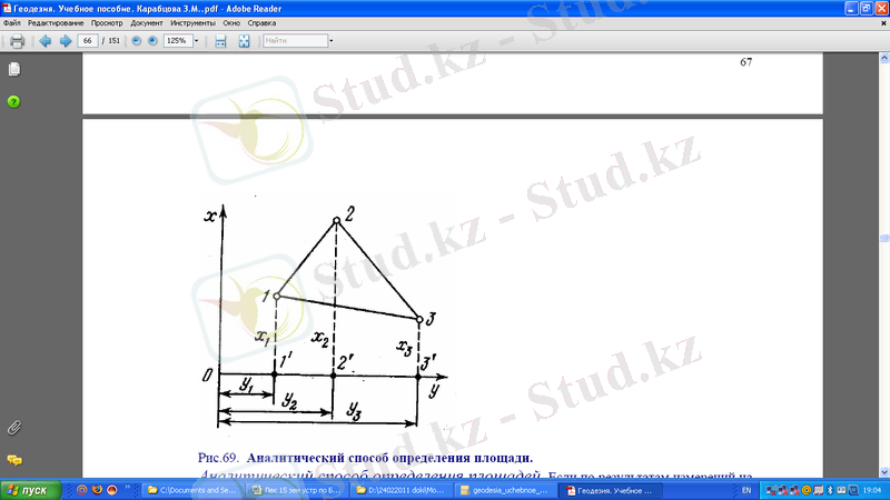 Мысалы 1-2-3 үшбұрышының төбесінің тікбұрышты координаталары белгілі (сурет 5. 3), осы төбеден Оу осіне перпендикуляр түсіріп, үшбұрыштың ауданын, үш трапеция ауданының алгебралық қосындысы түрінде жазуға болады. I - (1’-1-2-2'), II - (2'-2-3-3') және III - (1/ - 1 - 3 - 3/), яғни S=S1+SII+SIII.