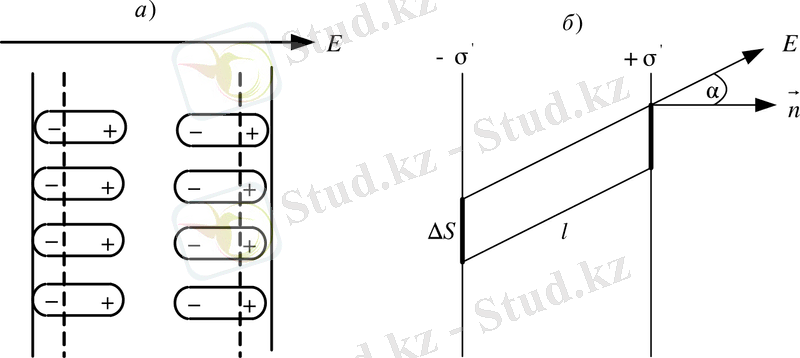 . Одан әрі пайымдауды жеңілдету үшін сыртқы өрістің әсерінен тек оң зарядтар ығысады, ал теріс зарядтар орнында қалады деп есептейміз. Бұл жағдайда көлемді көлбеу цилиндрге салынған молекулалардың оң зарядтары