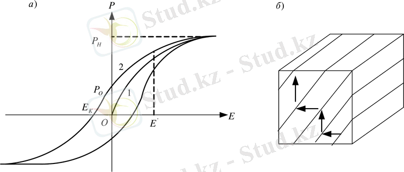 , ал ферроэлектриктердің диэлектрлік өткізгіштігі ондаған мыңға жетуі мүмкін. Үшінші ерекшелігі - поляризация векторының модулінің сыртқы электр өрісінің күшіне тәуелділігі негізінен сызықты емес (9, а-сурет) . 1-қисық негізгі поляризация қисығы деп аталады, өйткені оның басы нүктеде