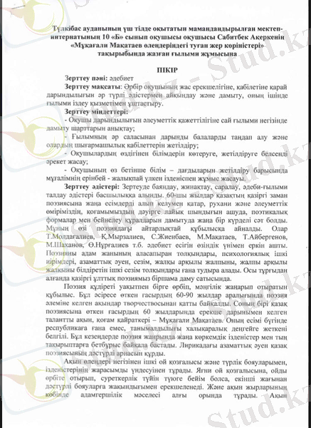 The main purpose of the work is to analyze the poet's lyrics about the Motherland by reading his poems on the theme of his native land in the works of Mukagali. To fulfill these goals, the following tasks were set: - to identify poems in Mukagali's works that characterize his native land; Mukagali Makatayev, the owner of a special talent, a unique poet of his time, remembered by his country, was fond of writing poetry from a young age, although he saw many difficulties. The first works began to appear on paper from the age of ten. The poet dedicates many of his works to his native land, love, and nature. In particular, I want to describe my native land. Each person will have their own place of birth. It looks very hot. As your native land, embraces are wide, love abounds. I wanted to explain that he, like your father, instills strictness and good manners. Describing your joyful times, the sweet times of Baldauren childhood, the poet writes his work