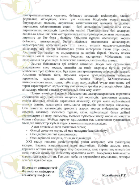 Ғылыми жетекшісі: Шымкент университетінің казак тілі мен әдебиеті кафедрасының Менгерушісі ф. ғ. к., доцент Кожабекова Р.