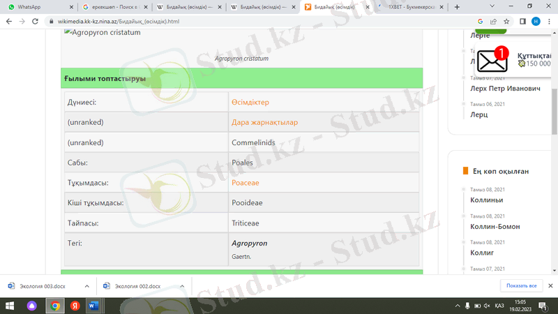 1. Еркекбидайық ( Agropyron Gaert. ) туысына жататын түрлердің биологиялық ерекшеліктеріне шолу жасау;