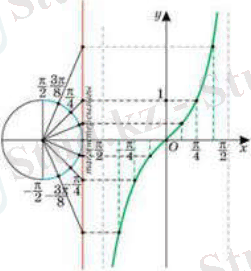 функциясы периодты және периодты π-ге тең. функциясының графигін салу үшін алдымен оның аралығына тиісті бөлігін саламыз. Ол үшін абсцисса осінде абсциссасы және ( болатын нүктелерді белгілейміз және тангенстер осін қолданамыз. осінің сол жағынан центрі осінде жататын бірлік шеңбер сызамыз. Бірлік шеңбер мен кесіндісін тең 8 бөлікке бөлеміз.