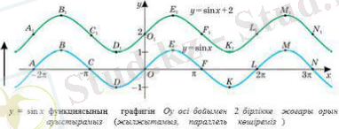 Шешуі. Алдымен функциясының графигін саламыз. Ол үшін A, B, C, D, O, E, F, K, L, M, N нүктелерін белгілейміз және оларды қисық сызықпен қосамыз. Одан кейін әрбір нүктені ордината осі бойымен жоғары 2 бірлікке жылжытамыз. Сонда A 1 , B 1 , C 1 , D 1 , O 1 , E 1 , F 1 , K 1 , L 1 , M 1 , N 1 , нүктелерін аламыз және оларды қисық сызықпен қосамыз.