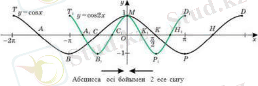 Шешуі. Алдымен функциясының графигін кесіндісіне саламыз. Ол үшін T, A, B, C, M, K, P, H, D нүктелерін белгілейміз және оларды қисық сызықпен қосамыз. Одан кейін әрбір нүктені абсцисса осі бойымен 2 есе сығамыз. Сонда ординаталары T, A, B, C, M, K, P, H, D нүктелерінің ординаталарымен бірдей, абсциссалары 2 есе кем T 1 , A 1 , B 1 , C 1 , M 1 , K 1 , P 1 , H 1 , D 1 нүктелерін қисық сызықпен қосып, көрсетілген аралықта берілген функцияның графигін аламыз.