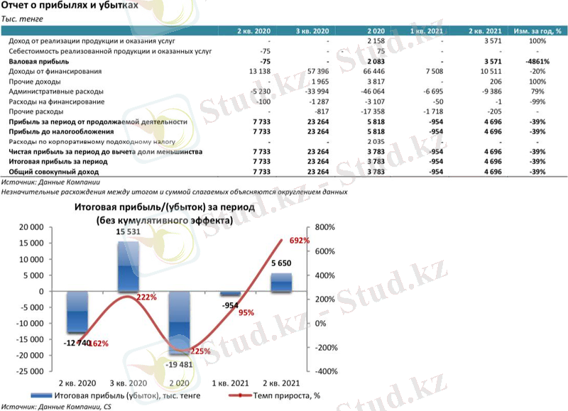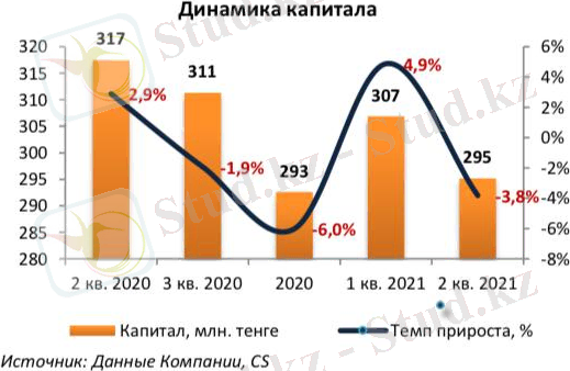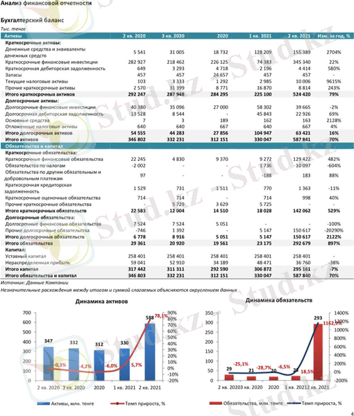 Қорытынды: ▪ 2021 жылғы 30 маусымдағы жағдай бойынша Компанияның активтері қысқа мерзімді активтер мен ұзақ мерзімді активтердің ұлғаюы есебінен 587 841 мың теңгені құрады және бір жыл ішінде 70%-ға өсті. Қысқа мерзімді активтер 79%-ға 524 420 мың теңгеге дейін өсті, оның құрылымында ақша қаражаттары мен олардың баламаларының 28 есеге 155 389 мың теңгеге және қысқа мерзімді қаржылық инвестициялардың 22%-ға 345 340 мың теңгеге дейін айтарлықтай өсуі байқалады. Ұзақ мерзімді активтер негізінен ұзақ мерзімді дебиторлық қарыздың 69%-ға 22 926 мың теңгеге дейін ұлғаюы есебінен 16%-ға 63 421 мың теңгеге дейін өсті. ▪ Қоғамның міндеттемелері 2021 жылғы 30 маусымдағы жағдай бойынша 292 679 мың теңгені құрады және қысқа мерзімді міндеттемелердің 6 есеге 142 062 мың теңгеге дейін және ұзақ мерзімді міндеттемелердің 22 есеге 150 617 мың теңгеге дейін өсуі есебінен бір жыл ішінде 10 есе өсті. . Қысқа мерзімді міндеттемелер негізінен қысқа мерзімді қаржылық міндеттемелердің 6 есеге 129 422 мың теңгеге дейін өсуі нәтижесінде өсті. Ұзақ мерзімді міндеттемелер негізінен 150 617 мың теңге сомасында басқа ұзақ мерзімді міндеттемелерді бекіту есебінен өсті. ▪ Капитал 2021 жылғы 30 маусымдағы жағдай бойынша бөлінбеген пайданың 38%-ға 36 760 млн. теңгеге дейін төмендеуіне байланысты бір жыл ішінде 7%-ға азайып, 295 161 мың теңгені құрады. ▪ Есепті кезеңнің соңында Компания 4 696 мың теңге таза пайданы тіркеді. Таза пайданы бекіту 3 571 мың теңге сомасында жалпы пайданы бекітумен байланысты. Бұл ретте әкімшілік шығыстар 79 пайызға өсіп, 9 386 мың теңгені құрады.
