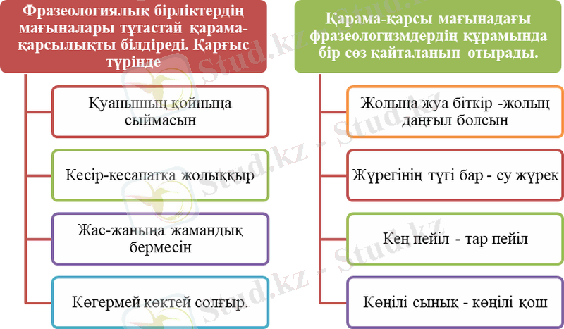 Мұндай құбылыс ағылшын тіліне де тән. F. e. look with another eye upon something (көзқарастары әр түрлі) - see eye to eye with somebody (көзқарастары бірдей), to be born under a lucky star (бақ жұлдызы оңынан туар) - to be born under unlucky star (бақсыздың жұлдызы солынан туар) [2]