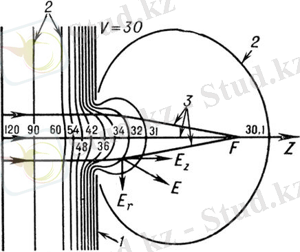 Сурет. 1. Дөңгелек тесігі бар диафрагма (жинау) : 1 - электрод-диафрагма; 2 - фигураның жазықтығы бойынша электростатикалық өрістің эквипотенциалдық беттерінің қималары; 3 - электронды траектория; F - линзаның фокусы. Біркелкі өріс сол жақтағы диафрагмаға жабылады. Эквипотенциалдарда сәйкес потенциал мәндері ерікті бірліктерде беріледі және бөлшектердің жылдамдығы нөлге тең болғанда потенциал нөлге тең деп есептеледі; V = 30 - электродтық потенциал. Электр өрісінің Е күшінің бойлық құраушысы E z электрондарды баяулатады, көлденең құраушы Er оларды бекітеді.