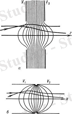 Сурет 2. Екі диафрагмадан (а) және екі цилиндрден (b) тұратын иммерсиялық электронды линзалар: жұқа сызықтар эквипотенциалдық беттердің сызу жазықтығы бойынша кесінділері; көрсеткілері бар қисықтар зарядталған бөлшектердің траекториялары болып табылады; V1 және V2 электродтық потенциалдар.