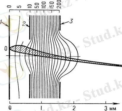 Сурет 3. Катодты электронды линза: 1 - катод; 2 - фокустау электроды; 3 - анод; жіңішке сызықтар - алдыңғы суреттердегідей эквипотенциалдық беттердің бірдей қималары. Потенциалды мәндер жоғарғы шкалада белгіленеді (катодта потенциал нөлге тең деп есептеледі) ; О - катодтың электрондарды шығаратын нүктелерінің бірі; көлеңкелі кеңістік - электрон ағыны алып жатқан аймақтың бөлімі.