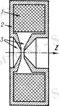 Сурет 4. Полюс бөліктері бар магниттік линза: 1 - қоздыру катушкасы; 2 - қабық; 3 - кеңестер. Қабық магниттік тізбек ретінде қызмет етеді. Полюс бөліктері магнит өрісін линзаның оптикалық z осіне жақын шағын аймаққа шоғырландырады.