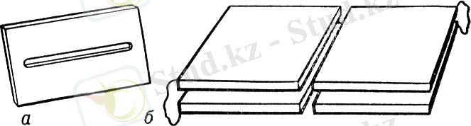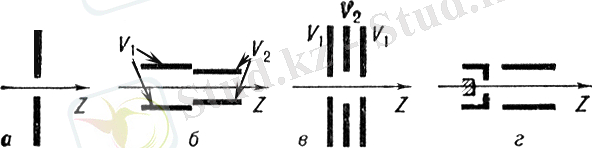 Сурет 5. Электростатикалық цилиндрлік линзалар: а - тілігі бар диафрагма; b - екі жұп пластинадан тұратын батыру линзасы. Зарядталған бөлшектер өтетін аймақта линзалардың өрістері диафрагма саңылауларына немесе көрші электродтардың пластиналарының арасындағы саңылауларға параллель бағытта өзгермейді.