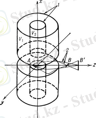Сурет 7. Екі коаксиалды цилиндр түріндегі электродтары бар және бөлшектер сәулесін өткізуге арналған сақиналы саңылаулары бар электростатикалық трансаксиалды линзалар: 1 - цилиндрлік электродтар; 2 - зарядталған бөлшектердің траекториялары; V1 және V2 электродтық потенциалдар. Объектінің А нүктесінен шығатын сәуле линза өрісінен өткеннен кейін астигматикалық болады және екі сызықтық В және В' кескінін құрайды. Параметрлердің белгілі бір таңдауымен линза стигматикалық (нүктеден нүктеге) кескін бере алады.