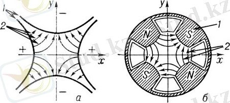 Сурет 8. Зарядталған бөлшектер шоғының қозғалыс бағытына перпендикуляр төртполюсті электростатикалық (а) және магниттік (б) электронды линзалардың көлденең қималары: 1 - электродтар; 2 - күш өрістерінің сызықтары.
