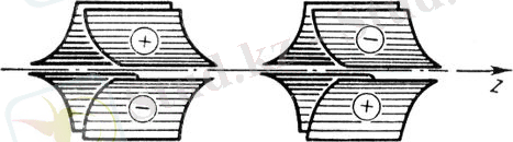 Сурет 9. Өрістері жүйенің z оптикалық осінің айналасында, біреуі екіншісіне қатысты 90° бұрышпен бұрылатын екі төрт полюсті электростатикалық линзаның дублеті.