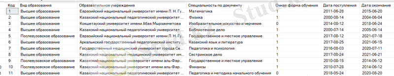 3-кесте. Қызметкердің білімі жайлы жалпы ақпараттан тұратын, яғни «Код», «Білім деңгейі», «Білім алған мекеме», «Құжат бойынша мамандығы», «Күндізгі оқу», «Оқуға түскен күні», «Оқу бітірген күні» атты алаңдардан тұратын «Білімі» атты кестені құрайды. (5-сурет)