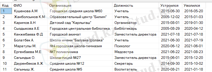 8-кесте. «Бұрынғы жұмыс орны» деп аталатын кесте өз кезегінде «Код», «Аты-жөні», «Мекеме», «Қызметі», «Жұмысқа орналасқан күні», «Жұмыстан шыққан күні» деп аталатын аймақтардан тұрады. (10-сурет)
