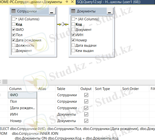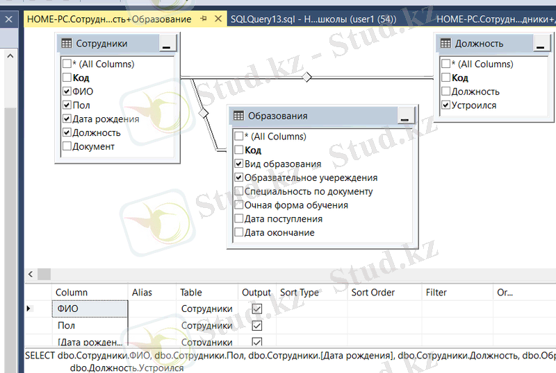 «Қызметкерлер» және «Құжаттар» кестелері арасында байланыс орнатқаннан кейін, сұранысты сақтау қажет. Сұрау нысан шолғыштығы «Мектеп қызметкерлері» ДБ «Views» папкасында пайда болады. (20-сурет)