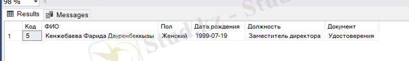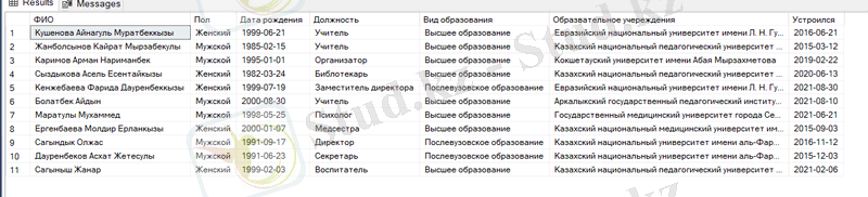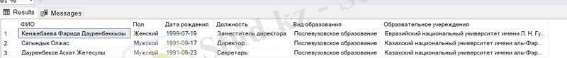 Біз сақталған процедураның тиімділігін тексереміз. Жаңа бос сұрау жасаңыз. Пайда болған терезеде бос сұраумен пәрменді теріңіз EXEC [Қызметкерлерді аты-жөні бойынша көрсету] ‘Кенжебаева Фарида Дауренбеккызы’ құралдар тақтасындағы «Execute» түймесін басыңыз, сонда 27-суреттегі нәтежиені аламыз.