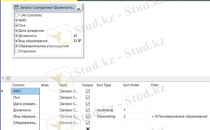 Енді сүзгідегі жазбаларды таңдау критерийін орнатамыз. Біздің сүзгі жоғары оқу орнынан кейінгі білім алған қызметкерлерді ғана көрсетсін. "Filter" бағанындағы шарт қойылатын өріске сәйкес келетін жолдағы көрсетілген өрістер кестесіндегі жазбаларды таңдау шарттарын анықтау үшін шартты көрсету қажет. Біздің жағдайда шарт "Білім деңгейі "айнлымыны қойылады. (23-сурет)