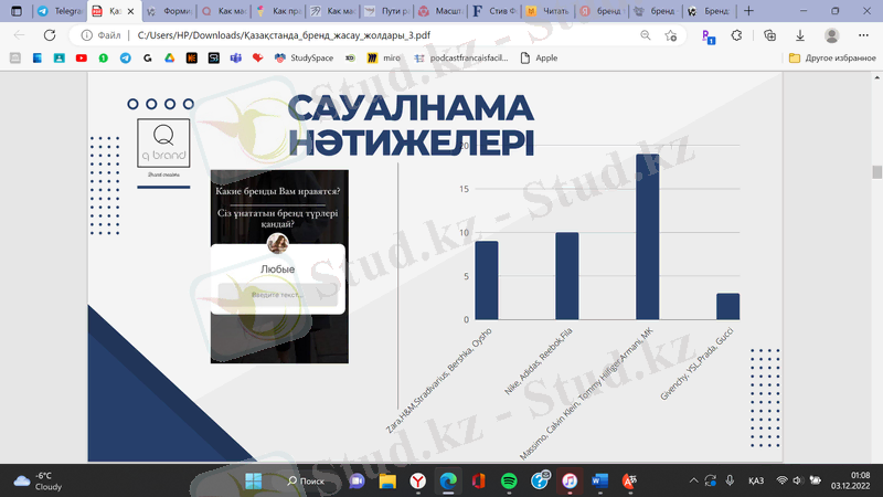 Екіншіден, жобамыздың ең өзекті және қызықты, сонымен қатар, қиын мәселедердің бірі - қоғам арасында сауалнама жасап, ең танымал брендтерді анықтау. Қазіргі заман талабы - бүкіл жаңа трендтердің алдында жүру, жастармен бірге бір қадам алға басу. Сондықтан да, жоба тақырыбына сай шамамен 15 сұрақтан кем емес тақырыпқа сай сұрақтар таңдалды: