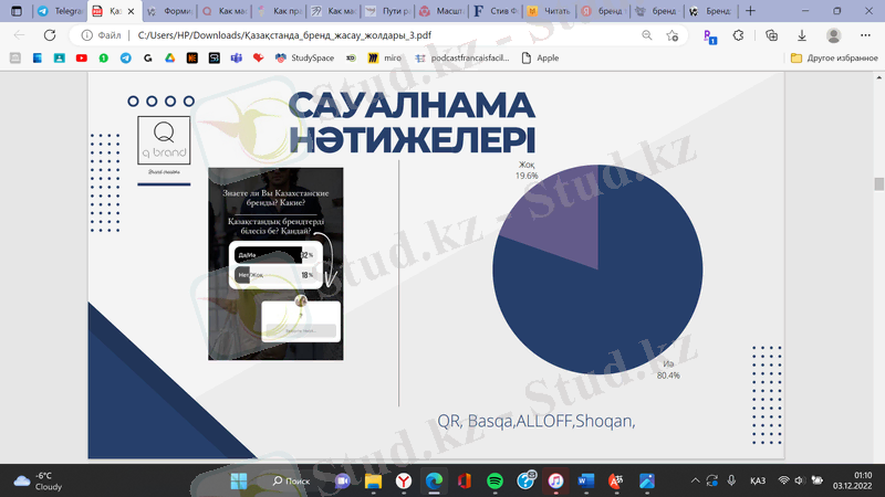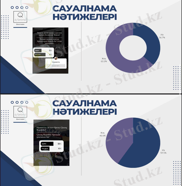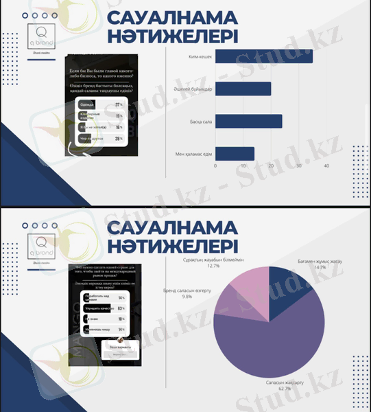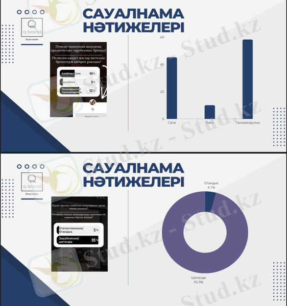 Сауалнаманың қорытындысына тоқталсақ, оқырмандардың арасынан көбіне шетелдік брендтер бағаланады; шетелдік брендтерді оқырмандардың 63, 5% танымалдылығына ғана мән береді; отандық бредтерді (QR, Basqa, shoqan сияқты) 80% білгенімен, өкінішке орай бағасы, сапасы жағынан қанағаттандырмайды; яғни, бұл нәтижелер арқасында біздің білгеніміз, отандық брендтер - дамудың бастапқы кезеңінде тұрғаны.
