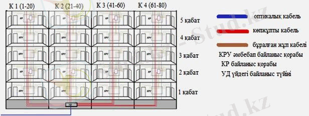 2. 2-суретте пассивті және активтіжабдықтары бар көп қабатты ғимаратқа вандал қорапшасының орнатылуы көрсетілген. Бұл қорапта байланыс орталығынан оптикалық кабель орнатылады, содан кейін UTP көп қабатты кабельдері орнатылады. Мұнда тік және көлденең сымдарды жалғау таратушы кубтарда 110 типті қондырғылардың модульдері арқылы жүзеге асырылады.