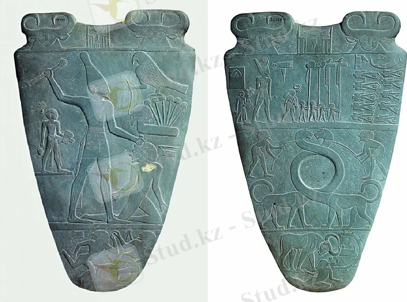 Осындай бейне жазу түрінің нағыз үлгісі перғауын Нармердің тақтасы, шамамен б. з. д. 3-мыңжылдықта жасалған биіктігі 64 см тақта Каир музейінде сақталған. Бұл рельефтік көркем туындының мазмұны - жеңіске жеткен перғауын Нармердің Ұлылығын баяндау. Сонымен, рельефті сипаттайтын болсақ, Мысыр әміршісінің қуаттылығын көрсетеді, оның жанындағы жақын шонжарлары одан үш-төрт есе кішірейтіліп бейнеленген. Құдай бейнесіндегі сұңқар Нармер патшаға жауын жеңуге өз көмегін көрсетіп тұрған сәті бейнеленген. Тақтаның астыңғы бөлігінде жаулардың алды-артына қарамай қашқан бейнелері суреттеледі. Тақтаның екінші жағында бейнеленген екі қабыланның ұзартылған мойындары композицияның негізгі орталық бөлігін құрайды. Өздеріңізге белгілі, алдында айтылып өткең адамның денесі сақталып, оны неғұрлым толық ұқсастықпен бейнелесе, өлген адамның жаны оған қайтып келеді деген түсінік болған . Сондықтан ол дөңгелек мүсінде өзінен-өзі түсінікті болса, бедерлі суретте белгілі бір тәсілдерді заңдылыққа енгізу кажеттілігі туындады және соның нақты үлгісін осы тақтада көреміз. Ол денесі тұтас көрсету үшін дененің жоғарғы жағың иықты, қолды алдынаң, аяқтары мен бас пішіні жанынан бейнелеу әдістері. Бұл жерде, канондық бейнелеу мен иероглифтік жазулардың алғашқы қадамдары династиялыққа дейінгі кезеңде қалыптасты деген тұжырым айтуға болады.