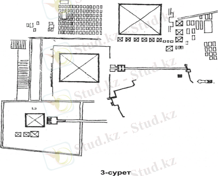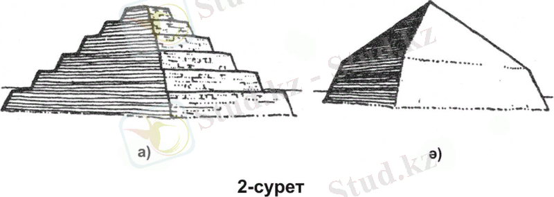 4. Дашурадағы Снофру пирамидасының қырлары түзу емес қисық, (26-сурет) жоғарғы бөлігі еңкіш болып келген. Оның ішіне алғаш рет тіреудің конструктивтік рөлін атқаратын еркін тұрған бағандар қолданылған. Жанында марқұмдардың 2 ғибадатханасы бар.