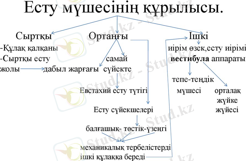 Есту мүшесінің құрылысы : есту мүшесі - құлақ. Құлақ 3 бөлімнен тұрады: сыртқы, ортаңғы және ішкі құлақ.