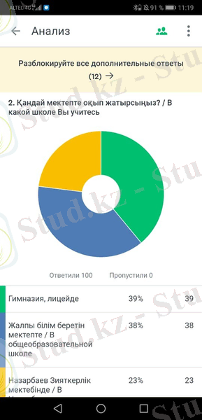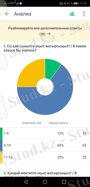 Сауалнама нәтижелері мен талдауыРеспонденттердің жаңа білім беру жүйесіне көзқарасын білу үшін сауалнамаға 1-11(12) сынып оқушылар қатысқан болатын. Қазіргі таңда 11-12 сынып оқушылар жаңа білім беру бағдарламаға көшпегендіктен және 1-4 сынып оқушылар әлеуметтік желілерде отырмағандықтан 50%-ын 5 пен 10 сынып аралығында оқитын жасөпірімдер құрайды. (1-диаграмма. ) Олардың көбісі лицей(39%) мен жалпы орта мектептерінде(38%) оқитын оқушылар. (2-диаграмма) .