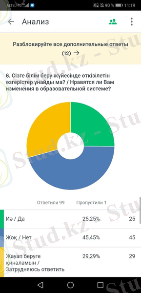 3. ЗЕРТТЕУ БӨЛІМІБұқаралық ақпарат көздері мен түрлі ғаламтордағы сайттардан жиналған ақпараттардың сенімділігі жоғары болғанымен, халық пен сарапшылардың пікірлері кейбір тұстарды толықтыруға көмектеседі. Сондықтан жаңа білім беру жүйесінің оқушы мен тұтастай елдің тұрақтылығына, дамуына қалай әсер ететіндігін саралау және ақпаратты толықтыру мақсатында әлеуметтік сауалнама мен сұхбат алынды.