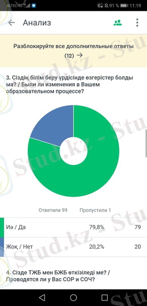 Теқ қана 1-10 сынып оқушыларында білім беру жүйесінде өзгерістер болғандықтан, 79 респондент 3 сұраққа “иә” деген жауап берген болатын. Яғни қалған 20, 2%-ын 11 мен 12 сынып оқушылар құрайды. (3-диаграмма) . 1 сыныптан бастап 10 сыныпқа дейін оқитын 85 оқушыларда 5 балдық бағалау критериалдық (БЖБ мен ТЖБ) жүйесіне өзгерген болатын. Қалған 15 оқушыда ескі білім беру жүйесі қалғанын байқауға болады. (4-диаграмма) .