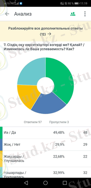 Жаңа білім беру жүйесіне көшкен 48 оқушыда оқу көрсеткіштер өзгерген болатын, ал қалған 29 жасөспірімде өгерістер байқалмаған. Өкінішке орай, бейімделуге аз уақыт берілген және жаңа жүйе туралы ақпарат аз болғандықтан респондеттердің 32, 99 %-ында бағалар нашарлады. Ал 23 респонденттер Назарбаев Зияткерлік мектеп оқушылар болғандықтан, олардың бағалары жақсы деңгейде екенін байқауға болады. (7- диаграмма) .