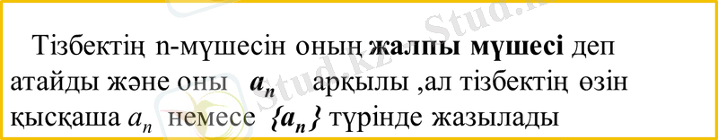 Анықтама . Мүшелерін нөмірлеп шығуға болатын шексіз сандар жиыны сандық тізбек деп аталады. Ал тізбекті құрайтын сандарды тізбектің мүшелері деп атайды.