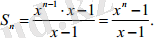 Прогрессияның бірінші мүшесі 1-ге тең, ал бөлгіш x-ге тең. Xn-1 n саны бар осы прогрессияның мүшесі болғандықтан, оның бірінші n мүшесінің қосындысын табу міндеті қойылды. (7) формуласын қолданайық: