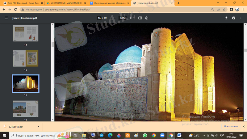 Зеpттеу жұмыcынa жaлпы cипaттaмa. Түркістан облысының орталығы, Түркістан қаласы - рухани астана. Онда Әзірет Сұлтан Қожа Ахмет Ясауидің мазары ерекше мәнге ие. Атақты Әмір Темір Әзірет Сұлтанға деген құштарлығымен оған арнап алып кесене арқылы білдірген. Талай заман өтсе де, Әзірет Сұлтан кесенесінің рухани қызметі арналып салынған кесене архитектуралық жағынан да, басқа қырынан да жан-жақты зерттеле береді. Кесенеде жазылған араб жазуларының мән-мағынасын ашу - заман талабы. Жазуларда аяттар мен хадистер және әртүрлі насихат сөздер орын алған, тарихи даталар да кездеседі, кісі есімдерін көруге болады. Диссертация жұмысында аяттардың арабша мәтіні, транскрипциясы және қазақ тіліндегі мағынасы берілді. Қожа Ахмет Ясауи кесенесіндегі жазулардың мәні атты тақырыпта исламтанулық зерттелулердің бірегейі де осы маңыздылығымен жұмыста толықтырылды.