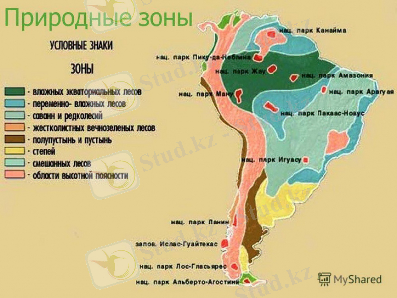 Оңтүстік Америкада географиялық орны мен климаттық жағдайларына сәйкес ормандар кең таралған. Оңтүстік Америка жерінде мынадай табиғат зоналары ажыратылады: ылғалды экваторлық ормандар (гилея), ауыспалы ылғалды (муссонды) ормандар, саванналар мен сирек ормандар, субтропиктік қатты жапырақты мәңгі жасыл ормандар мен бұталар, жалпақ жапырақты ормандар, субтропиктік дала (пампа) зонасы, шөлейт, шөл зонасы. Анд тауларында биіктік белдеулер тараған.