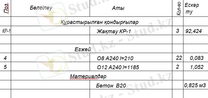 Кестеге сәйкес дәнекерлеу шарттарынан көлденең арматураны тағайындаймыз. 2 адж. Диаметрі 8 мм болатын 2 класс A240 және құрылымдық түрде орнату қадам 200 мм (ол 0, 5ℎ = 217, 5 мм артық емес) . Монтаждау арматурасы конструкциялық диаметрі 8 мм A240 класымен қабылданады және қадам 600 мм 5. 18 тармағына сәйкес. 5. 49-5. 50 тармағына сәйкес ілмектерді қабылдаймыз.