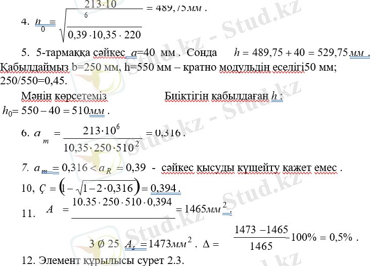 2. Тапсырма бойынша иілген темірбетон элементінің геометриялық өлшемдерін таңдаймыз: b = 200 мм, h = 500 мм, аралығы 6 м Бетон мен арматураның сипаттамалары (1-қосымша, 1, 2 кестелер) . ауыр бетон, B25 класы, Rb 14, 5 МПа . Коэффицентті ескере отырып μ b2 0, 9, 2. 8 тармағына сәйкес қабылданған Rb 0, 9 14, 5 13, 05 МПа . Бойлық жұмыс арматура класы A-400, Rs 355 МПа. Иілу моменті M=215 кН*м.