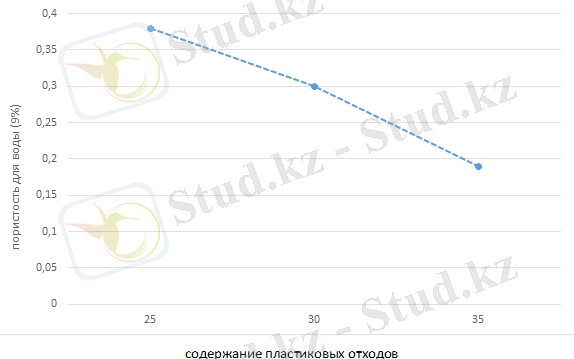 Бұл график политетилентерфталат үлесінің артуымен судың кеуектілігі төмендейтінін көрсетеді. Бірақ T1 және T2 үлгілері үшін кеуектілік мәндері өте жақын. Нәтижелер пластикалық қалдықтардан жасалған плиткалардың барлық үлгілерінің кеуектілік мәні өте төмен (5% - дан аз) екенін көрсетеді.