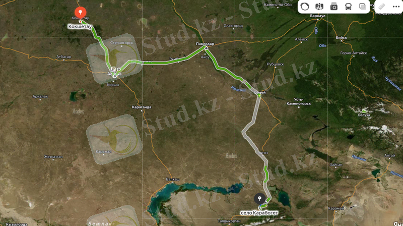 Сурет 1 - Көкшетау қаласынан Алматы облысындағы Сарканд қаласының Қарабөгет ауылындағы «КХ Абылкасымов Б. » шаруашылығына жеткізу маршруты.